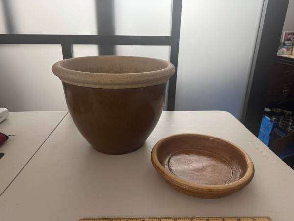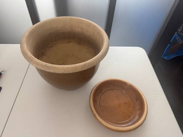 Large Vintage Thick Ceramic Plant Pot with Saucer Very good condition Dimensions: Pot Top diameter 11" Bottom diameter 7" Height 9" Saucer diamter 8"