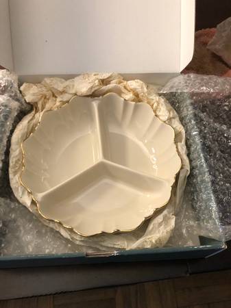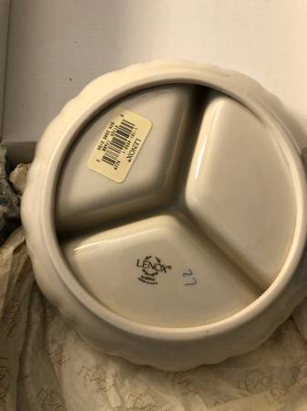 Lenox Symphony Round 3 Part Divided Condiment Dish in Ivory with Gold Trim. 8" in diameter, 2" high. This is a NOS item, never been used in original packaging.