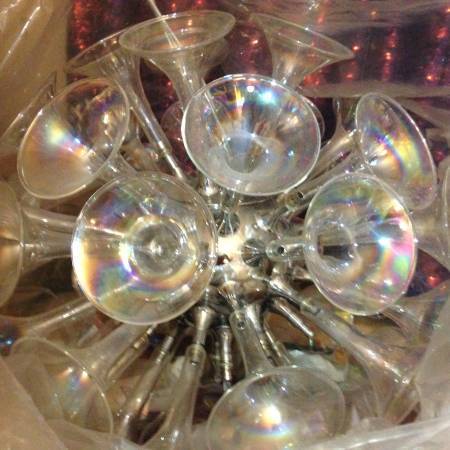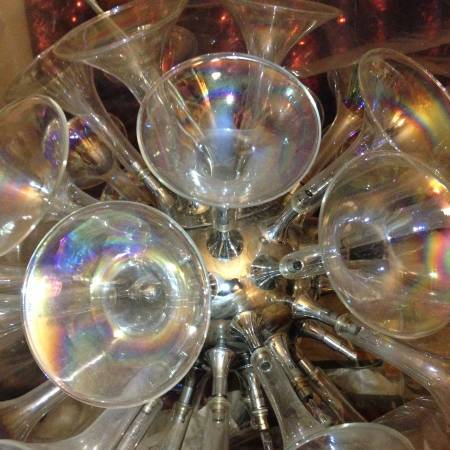 All pieces are included, missing no iridescent blown glass (approx 65 individual horn-shaped glass shades)