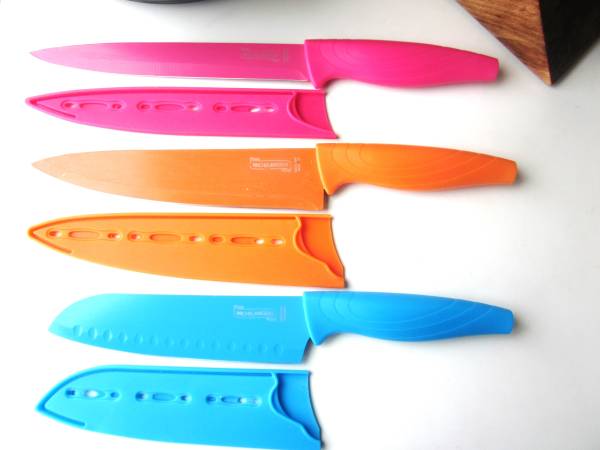 High carbon stainless steel knives for cutting meat, fish, cheese, fruits, vegetables, breads and so on. This knife set includes: orange 12.9" chef knife, blue 11.8" santoku knife, pink 13.2" slice knife.
