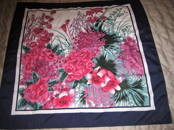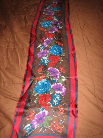 Pictured in order are a set of NEVER USED cross-stitch linen napkins, other linen napkins, double damask napkins, floral damask napkins, the next 4 pictures show scarves, the next two pictures show runners, picture 11 is a 27-inch doily, and the next picture shows a green leaf handkerchief, the next picture shows a pink cotton handkerchief, the next picture is quality fabric and the final picture is 42.5" by 14" upholstery fabric.