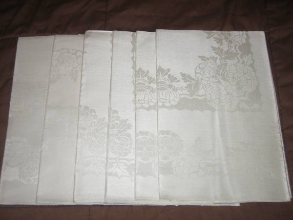 For sale are damask tablecloths. napkins, dish towels, doilies, runners, handkerchiefs, bandanas, silk scarves, throw pillows, a bath mat, a place mat, pot holders, and QUALITY FABRIC( regular & upholstery). Most of these items are from the 1940's and 1950's from my mother's estate.