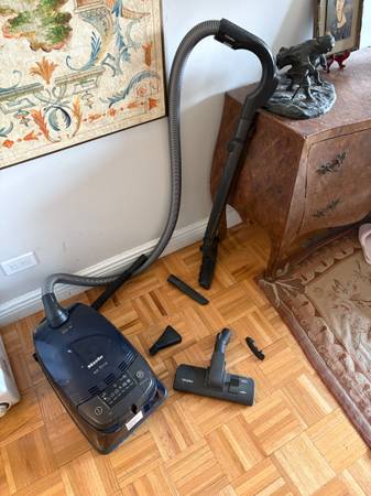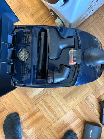 The Miele S658 is an absolute workhorse of a vacuum cleaner. It's an older model but works perfectly well and has been refurbished to include a new long length power cord, an ses 125-3 suction hose which is about 3 years old, as well as all of the fixtures pictured. I found that the large floor fixture attached in the picture, more effectively screwed on with a thick rubber band band around the screw threads. also, an attachment to open the canister for replacement of bags popped off. I've included it, just haven't figured out how to attach it back so I've been taping the canister shut. Totally effective. The whole setup went for about $1,200 new back when it was still in production.The suction hose alone goes for $169 and up online. Great piece of hardware.