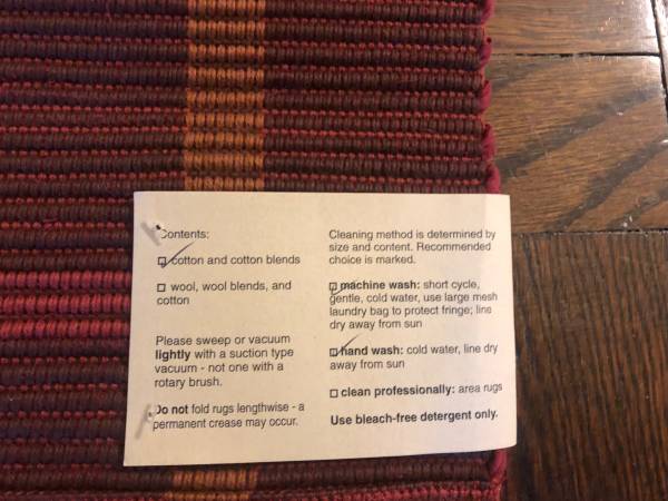 Never-used 2’ by 3’ hand-woven rug (Block Design) by Harriet Giles. The rug is made out of cotton or cotton blends. It can be hand or machine washed.