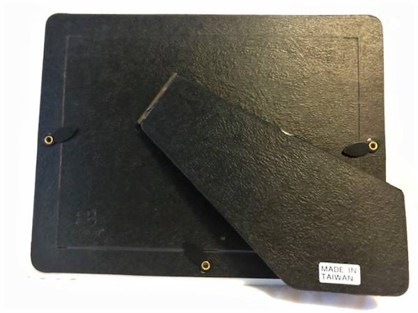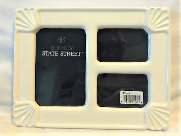 Never-used 3-photo white ceramic Burnes State St. picture frame, 9" by 7", suitable for photos that are 4 3/4" by 3" and 2" by 3",