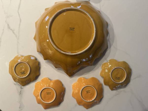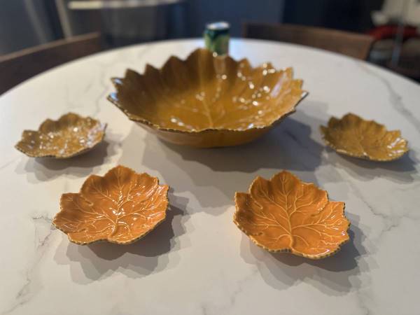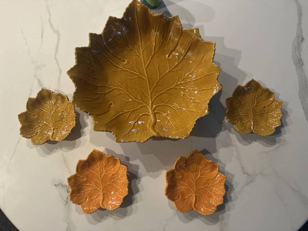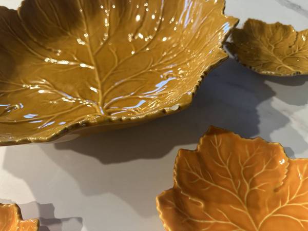 A heavy majolica-style serving bowl, in the shape of a golden maple leaf. Approximately 14" wide and 3.5" tall. ** There is a small crack at the edge of this serving bowl (shown in the last image)....