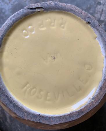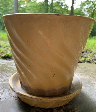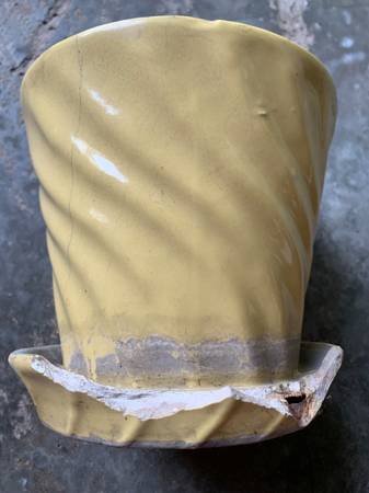 - Yellow-mustard Roseville Antique planter, very chipped on the attached saucer on one side: 6”h x 6” diameter:
