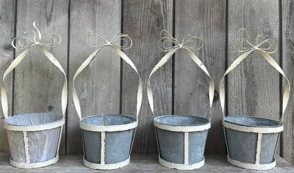 -(4) shabby chic tin baskets for plants (or goodies) are inset in white metal bow handles: Each $ 15. All 4 for $50.