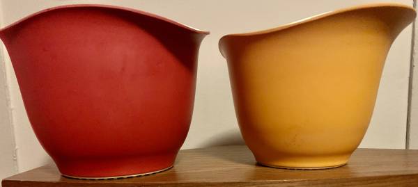 - (2) Vintage 1950's red and yellow melamine containers repurposed as planters: price lowered: $ 15. ea. Both for $25.