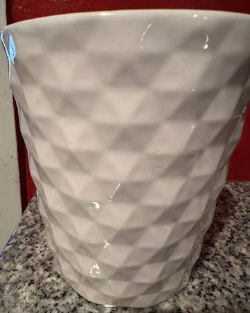 - White ceramic planter with geometric design. 5'5" height. Top diameter is 5". $10.