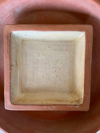 - 10" square with 7" interior Ivory glazed terracotta saucer, made in Italy. Also, use it as a tray or 10" side table-top: $ 15.