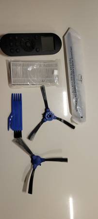 RoboVac complete of charging base, remote control, power adapter, cleaning tool, 4 side brushes, additional high performance filter and owner's manual