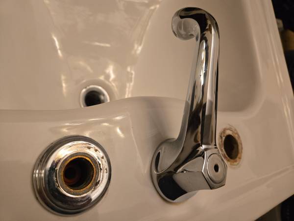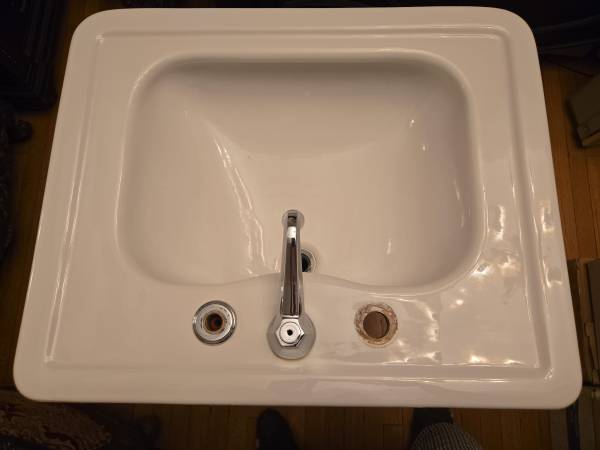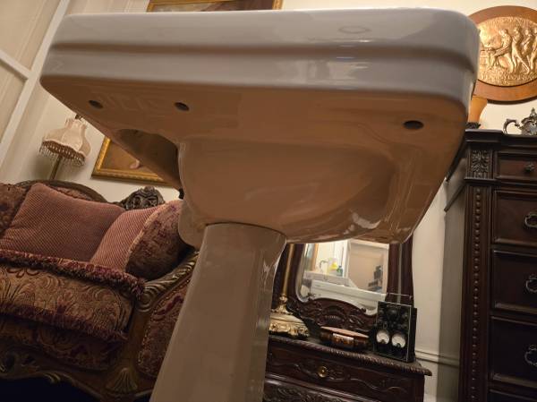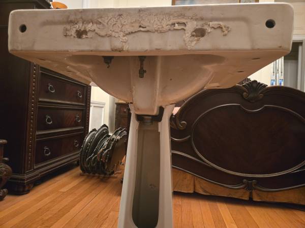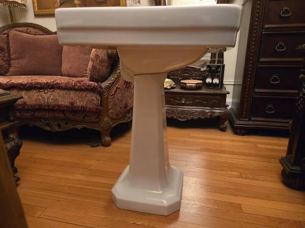 This is a Sbordoni 5770 Neoclassica sink with a 5771 pedestal. Dimensions 26.5" wide, 21.5" deep, 32" high. Very good condition, most of the surfaces look brand new. There are a few blemishes in the bowl, one on the left top and one on the left side (see pics, none are very noticeable and from a couple feet away they're invisible), as well as a scratch on the right side of the faucet. A premium quality vitreous china pedestal sink that is very hard to find. Local pickup only, Upper West Side of Manhattan. Note phone number is a landline, no texts.