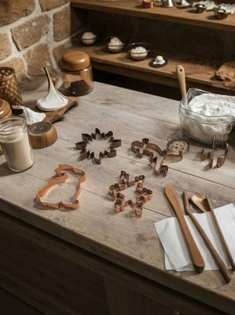 Selling a set of four copper cookie cutters in unique and intricate shapes: a bunny, a snowflake, a lizard, and a sun/leaf. These are great for baking or can also be used as charming rustic kitchen decorations.