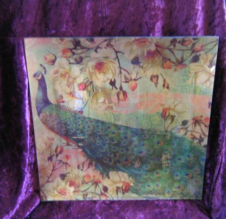 PEACOCK PLATTER. Square 12 1/2 x 12 1/2". glass with foil gilding depicting peacock in a flower garden against a gold background. $25. Phone number please