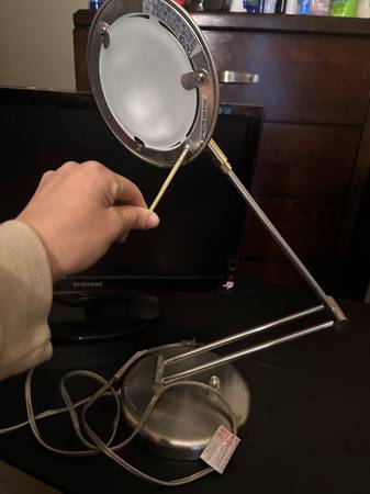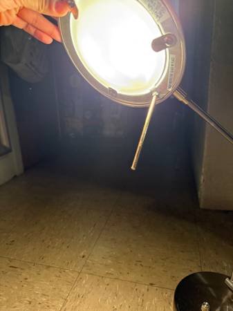 Gently used stainless steel portable table adjustable V- light 15”or 18” LED lamp. Adjustable lights. Moves side to side, included lightbulb. Dm if interested.