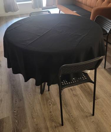 50% off, a like-new tablecloth in black, 70" round, used a handful of times, 55% cotton and 45% polyester. Doorman building pick-up. Thank you.