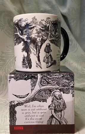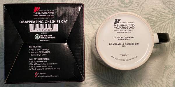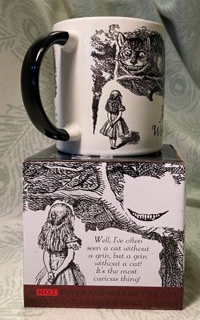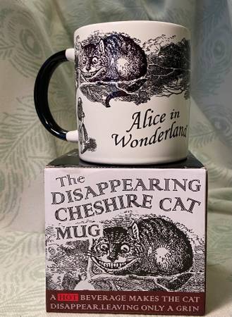 The Disappearing Cheshire Cat Mug is a unique and whimsical coffee mug inspired by the iconic character from Alice in Wonderland. This medium-sized mug features a painted design of the Cheshire Cat's grinning face, which disappears as the mug is filled with hot or cold beverage. Made of ceramic and porcelain, this modern style mug holds up to 10 oz of drink and comes in a round shape with a drink-through lid. Perfect for all occasions, this licensed reproduction by The Unemployed Philosophers Guild is a delightful addition to any collection or a fun gift for fans of the Alice in Wonderland franchise.