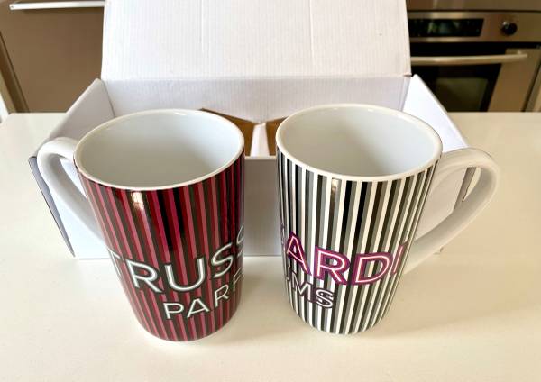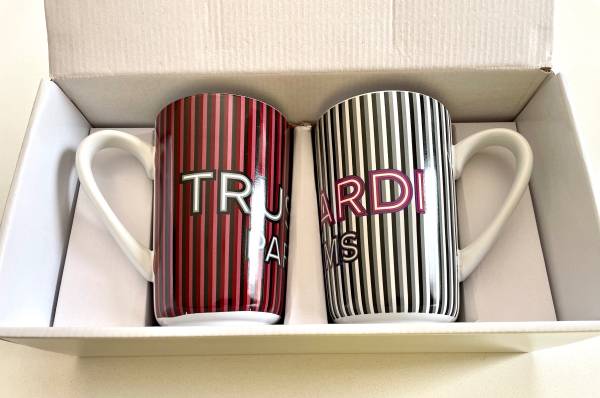 Great large ceramic mugs by Trussardi!! Set of 2. Holds 12oz of liquid. Ceramic. Dimensions: 13.1"L * 6.5"W * 4.3"H. Brand New! Packed in the original box! Very beautiful! Highly recommended!!