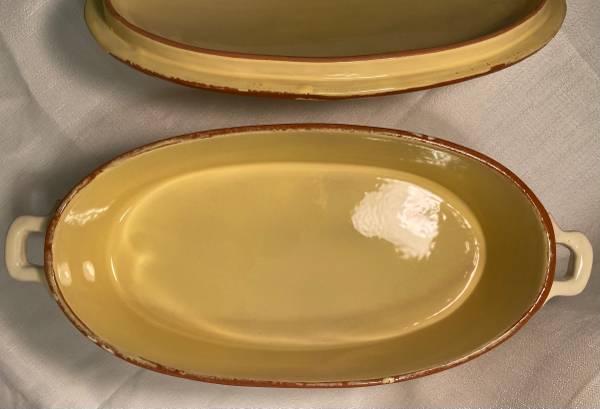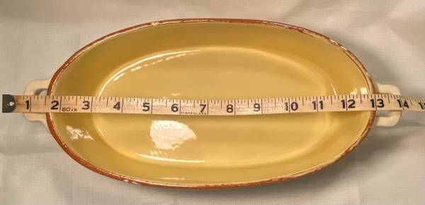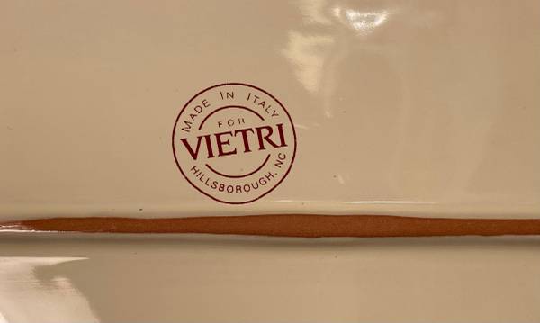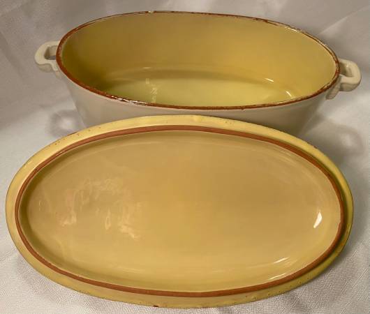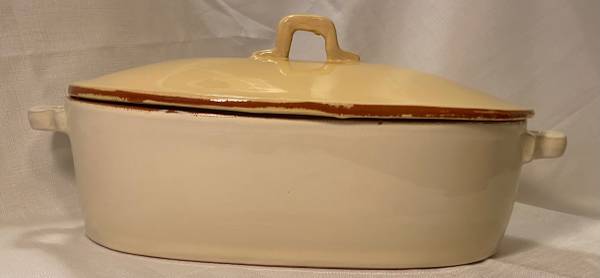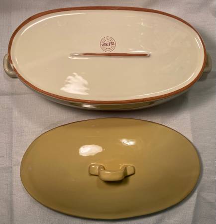The Vietri Cucina Fresca 2.25 Quart Casserole Dish with Crema/Saffron Lid is a beautiful and functional piece of decorative cookware that is perfect for all occasions. Made in Italy with a glossy finish, this contemporary style dish features covered handles for easy transportation. The oval shape and 2 quart size make it ideal for serving comfort food dishes. The casserole dish and lid set includes a "Vietri logo" backstamp, adding a touch of authenticity to this handmade, vintage original piece.