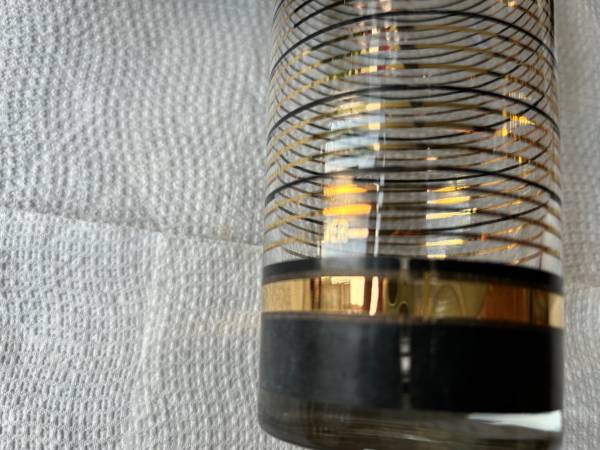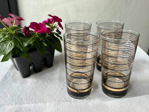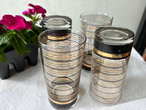 4 vintage black & gold Culver glasses (22 carat gold), 2 3/4" diameter, 5 9/16" high. The glasses are marked Culver and are in very good condition with some scratches.