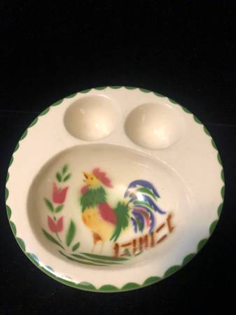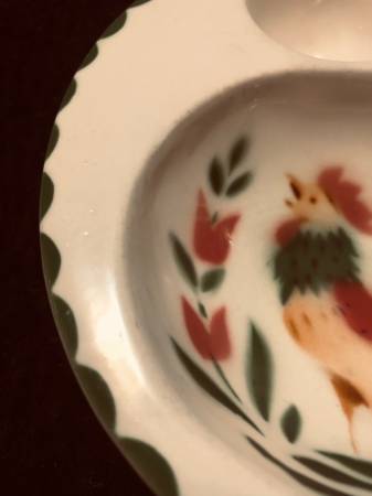 Vintage Cardinal rooster egg cup plate, 6 1/2” in diameter, 1 1/4” high, has minor scratches and pitting, good condition