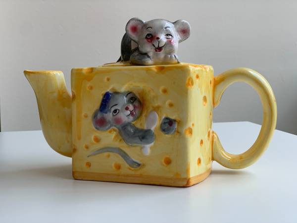 Vintage Ceramic Tea Set (3 items) - 20th Century Mischievous Mice Playing on Top of Cheese Wheel By Polystar - Europe Collection Set includes: -Teapot with lid -Sugar pot with lid -Napkin holder