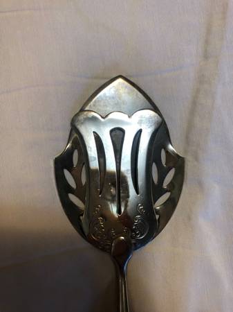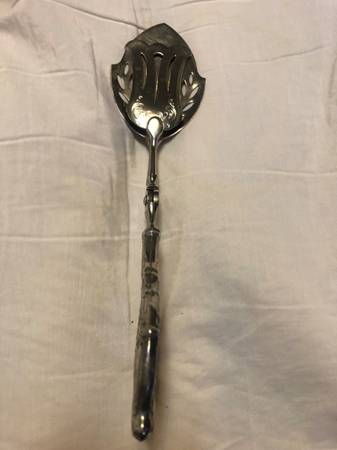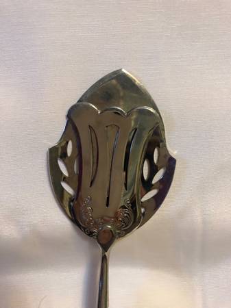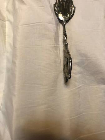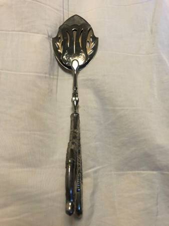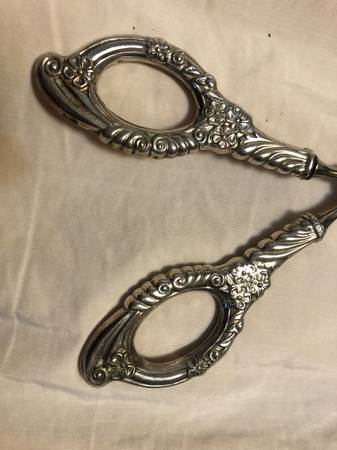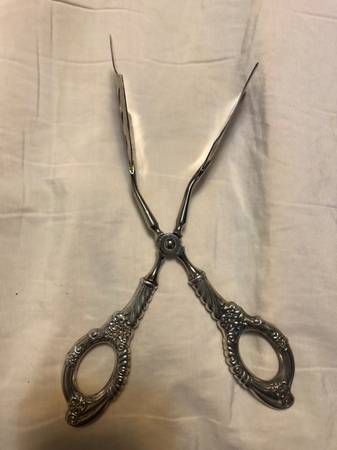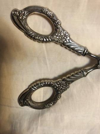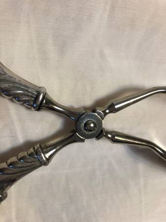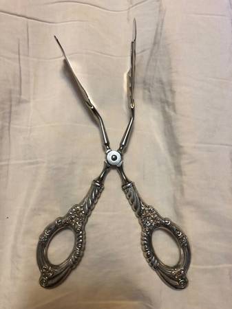 Vintage sterling (handle) serving tongs from Germany. These tongs are 8 1/2" long. Theyare in good condition with some marks on the flat serving pieces.