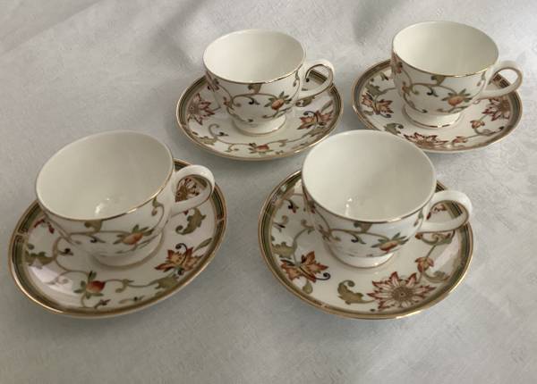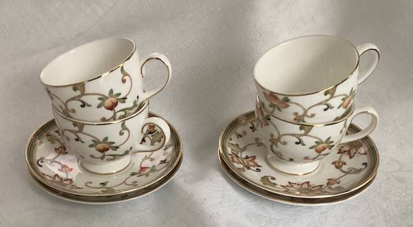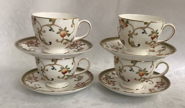 Featuring a set of four (4) footed cups and saucers in the Oberon pattern by Wedgwood made in England. In excellent condition The cup stands 2 3/4” tall and measures 3 1/4” across and the saucer...