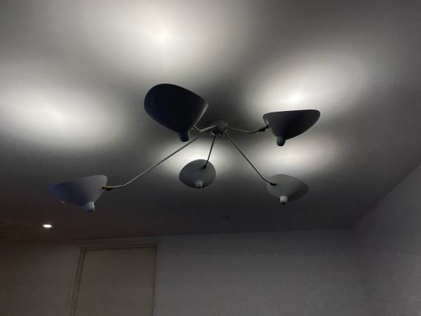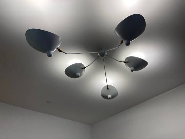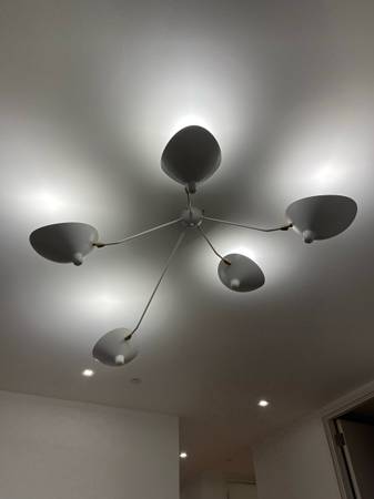 Brand new in box (unopened). White lacquer finish as shown in photo of scone and base. Had it custom made from China to fit in 15x13” room. Light source E26/27 Inspired by Serge Mouille Spider light