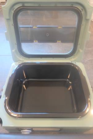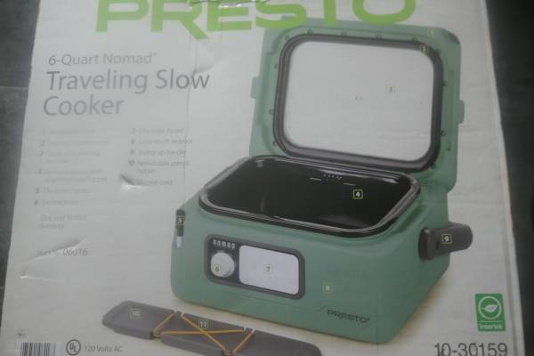 Originally $92.53 after sales tax. New in box. Ideal for slow cooking foods at home and taking it to on the road for dinner parties, camping trips, picnics...etc. Low profile design to prevent tipping over. Hinged, removable cover with large glass window is easy to clean. Acts as a warmer if plugged into a car AC/DC inverter.