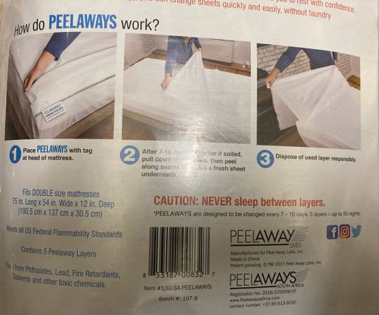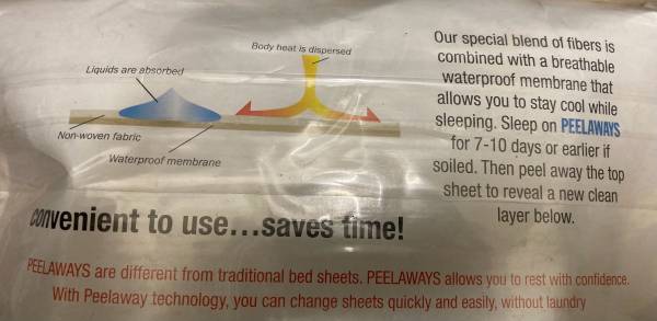 From the package: "Convenient to use, saves time. Peelaways are different from traditional bedsheets. Peelaways allows you to rest with confidence. With Peelaway technology, you can change sheets quickly and easily, without laundry. The special blend of fibers is combined with a breathable waterproof membrane that allows you to stay cool while sleeping. Sleep on Peelaways for 7-10 days or earlier, if soiled, then peel away the top sheet to reveal a new clean layer below."