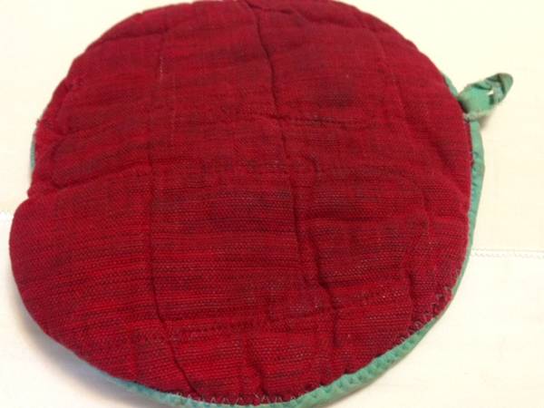 -vintage embroidered chicken with 2 button eyes potholder, 8" round, has a hook for hanging, small tears on the back - $15 -brown and green quilted 6" round potholder with hook for hanging, minor...