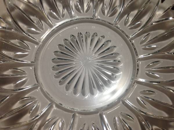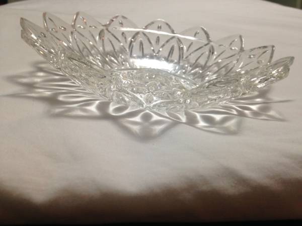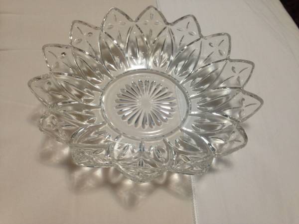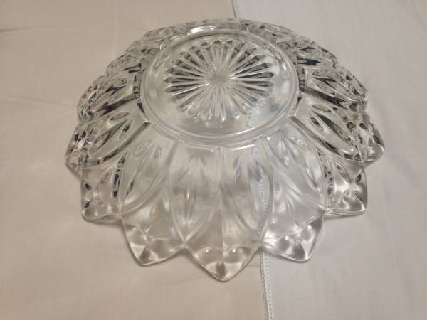 pretty glass bowl with scalloped edges in excellent condition, 8 1/2" wide, has minor scratches $40