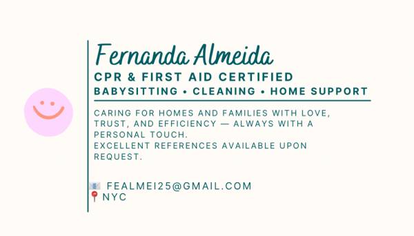 My name is Fernanda Almeida (27), and I have 5 years of professional experience as a Nanny and House Cleaner. I genuinely love what I do!