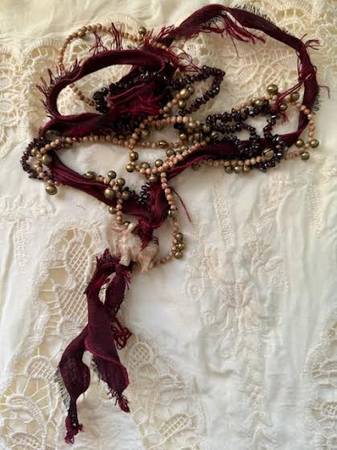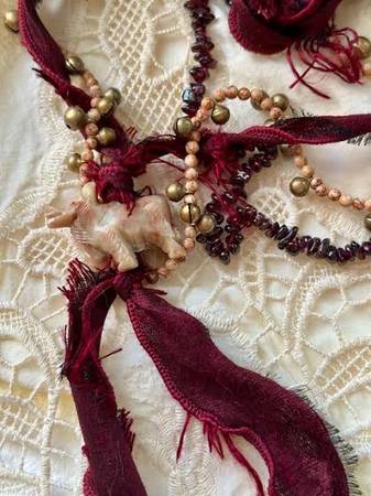 This piece is made of Garnet small chips long straight necklace, Picture Jasper 4mm with little bells long necklace and dog pendant ( carved Soap Stone) on a long silk distrassed ribbon.