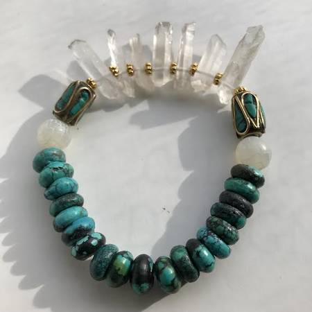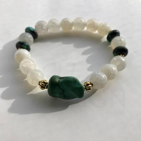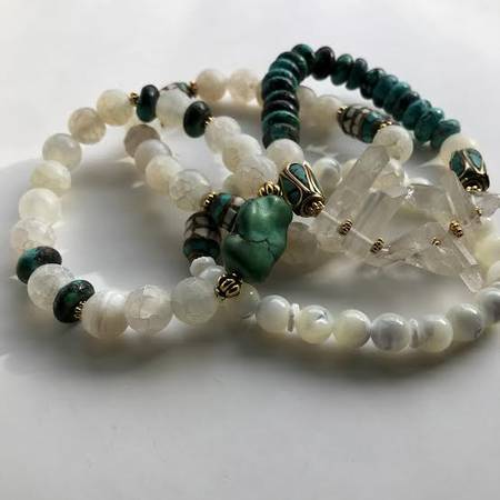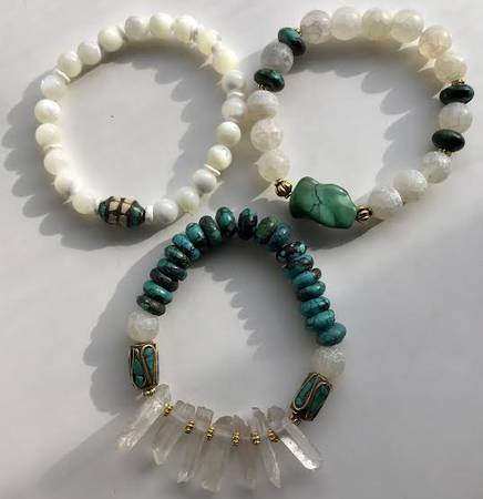 Brand new, Bundle of 3 gorgeous handmade stretch bracelets Size 6, and 6.5 ( for slim wrist) Materials: Turquoise Frosted White Agate 10MM Raw Crystals Snail Shell Beads 8MM Tibetan Inlaid Focal...