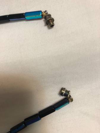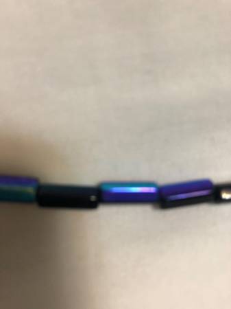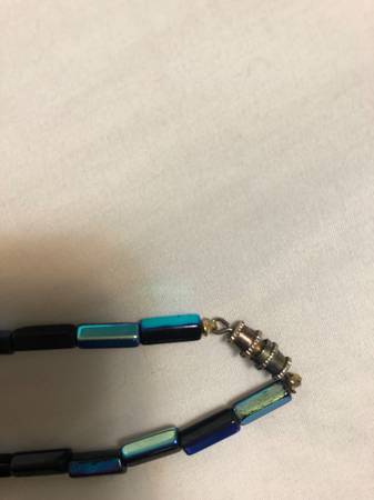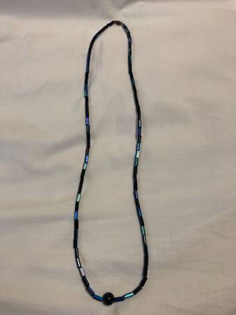 Vintage black & blue beaded necklace with screw-on clasp, has one center black bead, is 33" when opened, has some staining on light side of black beads