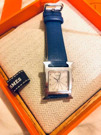 Hermes ladies HH1 210 21mm stainless steel case signature H watch, with never worn italian-made blue leather strap.