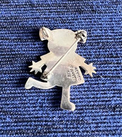You are viewing a sweet, cartoon style in the shape of a little girl with two ponytails, Mexican sterling silver pin/pendant. The pin measure 1 1/2 inches tall and about 1 1/4 of an inch at its widest point. It is marked Mexico 925 and weighs 9 grams. This pin also has loop so it can be worn also as a pendant or a charm. This piece is in beautiful condition and comes from a smoke free, animal free home. Don’t let this fabulous piece pass you by!!!