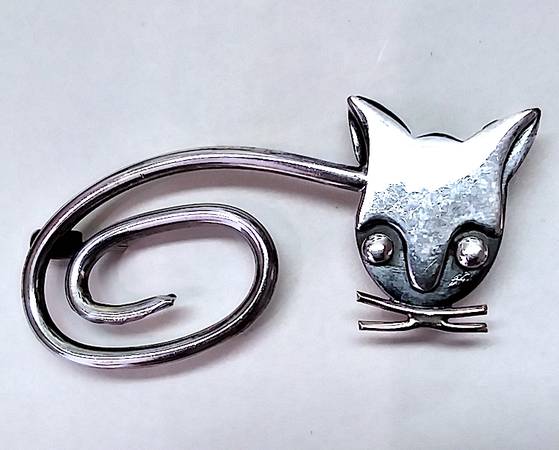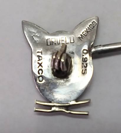 Beautiful sterling silver cat pin/brooch by the Mexican artist Orvelo. Measures approx 1 5/8" x 3/4", with secure safety clasp. Marked Taxco, Mexico, 0.925, Orvelo, & Eagle. Excellent condition (compare to others on the web) Makes a perfect gift, especially for any cat lover. Modern, unique design. (my lighting changes the hue of the silver in pix) *Can be picked up in Springfield, Massachusetts area OR New York City. Just need enough notice / Cash only