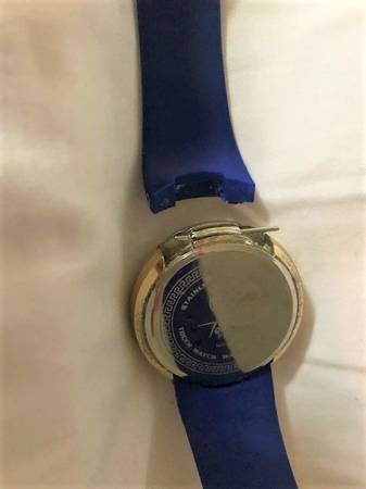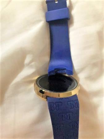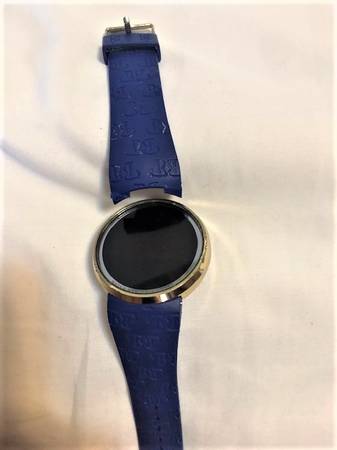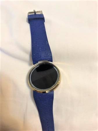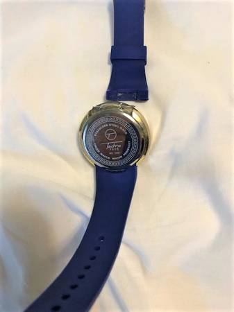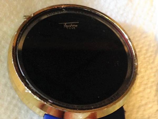 Techno Pave black on gold digital touch-screen sports watch with stainless-steel back, doesn't work, but probably just needs a new battery, has a partially detached band, with the original pin for the band. Has some chips on the gold rim, Being sold as is.