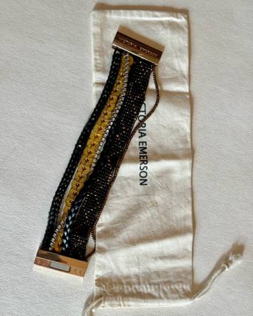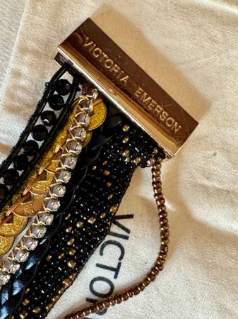 Victoria Emerson Beaded Gold-tone bracelet with coins and seed beads. Gold & Black Boho, Crystal Chain Slightly used. No major flaws noted Size 6.5-7