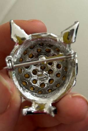 A true vintage piece made of light blue rhinestones. The round part of the cat's face is about the size of a quarter. One tiny stone is missing under the cat's chin, but you can barely see it. $29