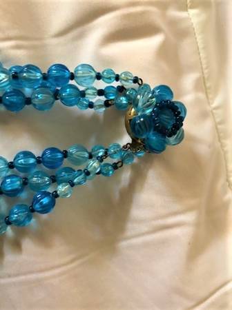 Vintage 3-strand blue beaded necklace with flowered clasp, 18", excellent condition