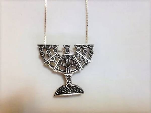 925 silver and marcasite menorah on Italian silver 11 3/4" chain. This pendant/brooch is 1 1/2" wide and 1 1/4" high. It has never been worn and is in the original box.