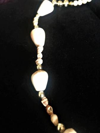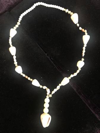 Vintage seashell, pearl and gold beaded beige necklace with dangling shell pendant, no clasp, hangs 14 1/2" , very good condition