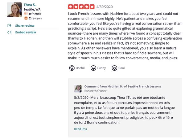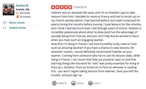 My name is Hadrien and I have been teaching French from the beginner to advanced level for over 15 years now. (see pictures attached or search "Seattle French Lessons" on Yelp for reviews)