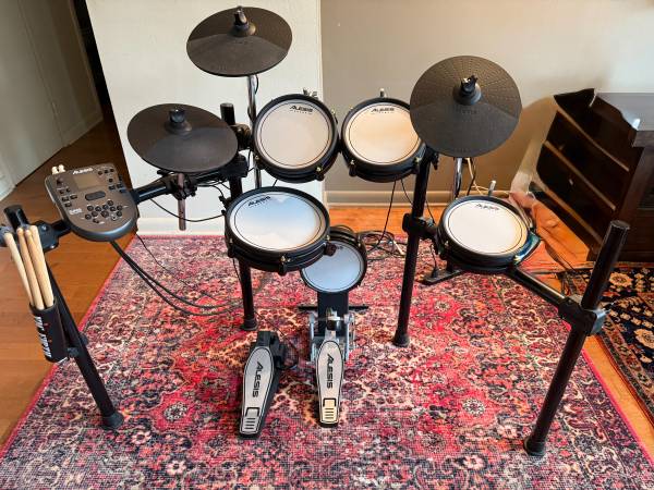 Excellent mint condition. Barely used. Ready for pickup from a doorman building. https://www.alesisdrums.com/electronic-drum-kits/surge-mesh-special-edition/ Including drum rug: Drum N Base Vintage...