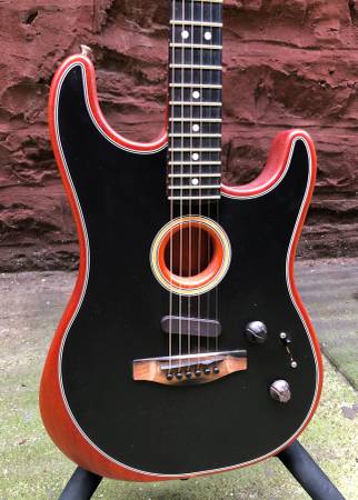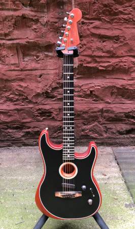 2020 Fender American Acoustasonic Stratocaster Acoustic-electric Guitar in black. Picked it up used a few years ago but didn't get to play it much. Cleaning out equipment I haven't been using. This one is in near new shape, only minor pick scratches from light use. Electronics are all working great and it's very easy to play.